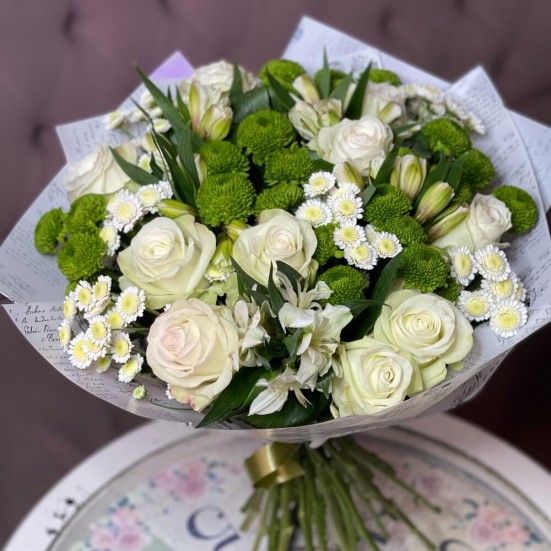 Букет «Розы и зеленые хризантемы»
